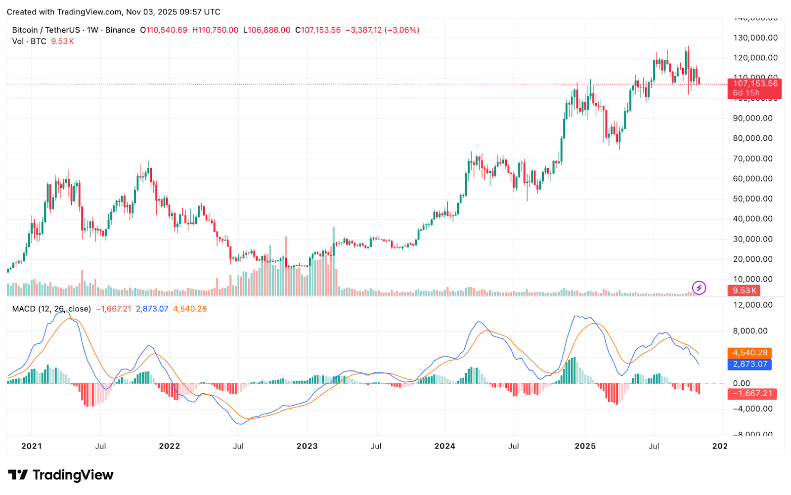 Das monatliche MACD-Histogramm erzeugt kleinere Spitzen statt neuer Hochs, was eine bärische Divergenz ähnlich dem Bitcoin-Hoch von 2021 erzeugt. Diese technische Schwäche bleibt trotz bullischer Makro-Nachrichten bestehen, was auf ein strukturelles Zögern an wichtigen Widerständen hindeutet.